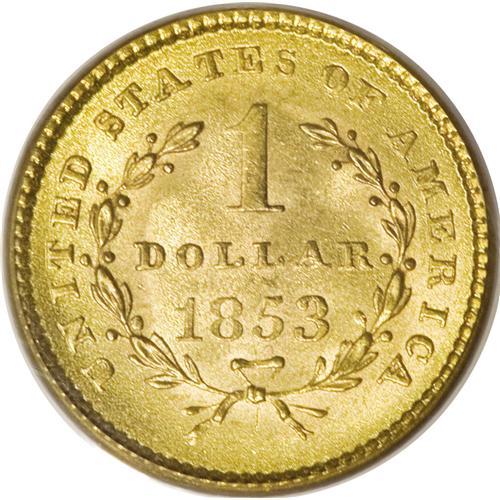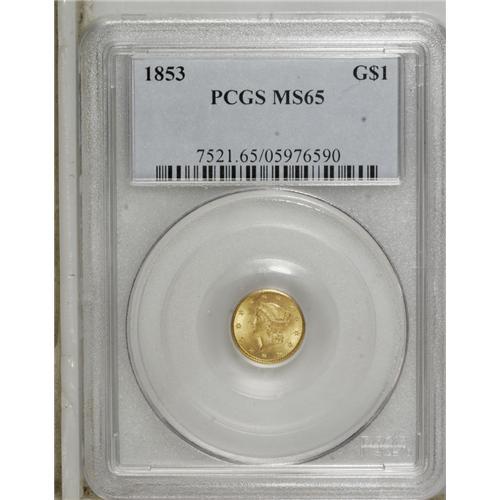 <B>1853 G$1 MS65 PCGS.</B></I> The 1853 is perfect for type purposes, as the issue "...is by far the most common United States gold dollar" (Jeff Garrett and Ron Guth, 2006). It is readily available through near-Gem condition, but becomes somewhat more challenging any finer. Gorgeous peach-gold surfaces display excellent luster and a satiny finish, and are devoid of significant marks. Crisply struck throughout.<BR><BR><b>Shipping:</b> Coins & Currency (<a target="_blank" href="http://www.heritageauctions.com/common/shipping.php">view shipping information</a>)