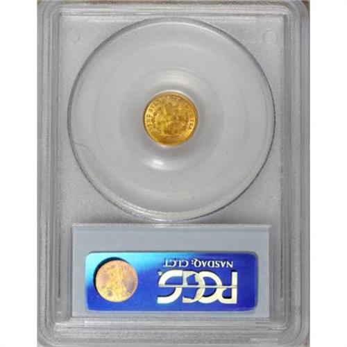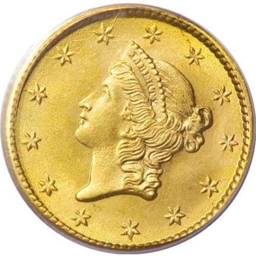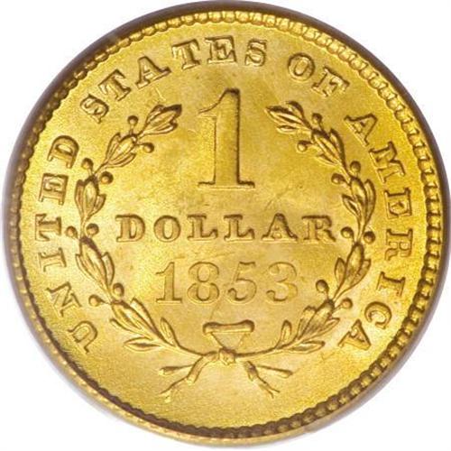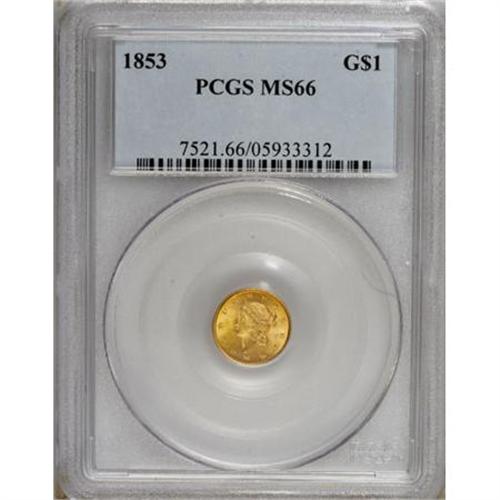 <B>1853 G$1 MS66 PCGS.</B></I> This vibrantly lustrous gold dollar displays lovely apricot-gold toning that seems imbued with underlying accents of lime-green. The design motifs are crisply and essentially fully struck on each side. Clash marks are absent, while spidery die cracks are noted near the obverse periphery. A couple of superficial pinscratches, near DOLLAR and the date on the reverse, preclude an even loftier grade assessment for this desirable Premium Gem. <BR><BR><b>Shipping:</b> Coins & Currency (<a target="_blank" href="http://www.heritageauctions.com/common/shipping.php">view shipping information</a>)