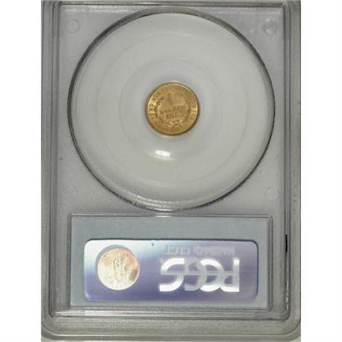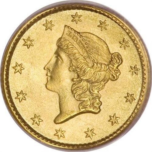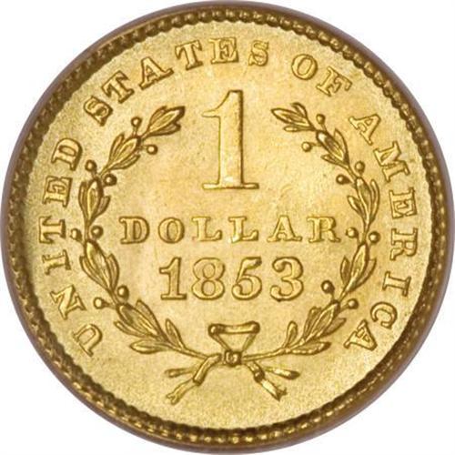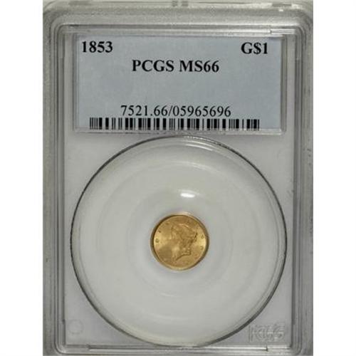 <B>1853 G$1 MS66 PCGS.</B></I> A frosty, thoroughly pleasing, and pretty Premium Gem of this available date, save for one complaint, a straight, hair-thin scrape that runs from the rim near 9 o'clock, through Liberty's lower neck and back to the rim at 5:30. While not readily visible without a loupe, it certainly appears to be a post-strike scrape, without which this wonderful piece might have graded MS67. Boldly struck throughout, and with enormous appeal despite the small distraction. Population: 24 in 66, 11 finer (3/08).<BR><BR><B>Coin Engraver:</B> James B. Longacre<BR><BR><b>Shipping:</b> Coins & Currency (<a target="_blank" href="http://www.heritageauctions.com/common/shipping.php">view shipping information</a>)