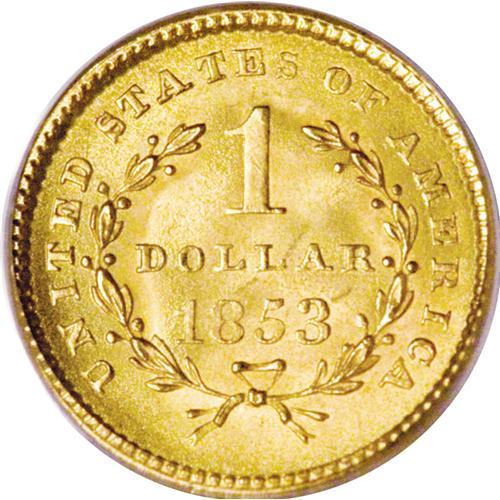 <B>1853 G$1 MS67 PCGS.</B></I> The design elements are remarkably well struck on both sides of this lovely little jewel. Even LA in DOLLAR is nearly completely formed. Gleaming mint frost illuminates the yellow-gold surfaces, that reveal fine-grain field textures and near-perfect preservation. As Garrett and Guth observe, in their <I>Encyclopedia of U.S. Gold Coins</B></I> (2006), the 1853 is by far the most common date in gold dollar series. In Superb Gem condition, however, the issue becomes exceedingly scarce, and very few have been so graded by the two major services. It seems like a foregone conclusion that such a pleasing, high grade specimen will generate considerable attention when it crosses the auction block.<BR><BR><b>Shipping:</b> Coins & Currency (<a target="_blank" href="http://www.heritageauctions.com/common/shipping.php">view shipping information</a>)