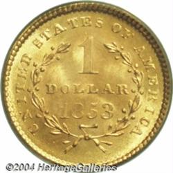 <table><tr><td><table><tr><td>1853 G$1 MS68 PCGS. A truly captivating example of the issue as well as the type, both sides are awash in scintillating frosty luster. The color is a rich orange-gold shade with suggestions of even more vivid reddish-gold overtones here and there. A couple of tiny swirls of slightly deeper color are noted in the obverse field before, above, and below Liberty's portrait. There is not a single bothersome handling mark, but several interesting obverse die cracks are evident at the left border and along the truncation of Liberty's neck. Striations in several areas of the reverse field and faint clashmarks at the back of Liberty's head can be seen under a loupe. The eye appeal and technical quality of this coin are equally difficult to surpass. Population: 1 in 68, 3 finer (3/04). <BR><BR><B>Important notice:</B> Heritage usually auctions material at the rate of 200-250 lots per hour. On some occasions eBay Live bid software or the Internet may not be able to keep up with the pace of the auction. We recommend placing a realistic absentee bid now as insurance to avoid disappointment. Occasionally the auctioneer may eliminate or reject an eBay Live bid, and the auctioneer may also reopen a lot after the close of the eBay live bidding (usually because we missed an audience bid), and may reject your bid even if it shows you as the winning bidder. By bidding via eBay Live, you agree that Heritage may award the lot to another bidder at its sole discretion under the circumstances described above or any other reasonable circumstances. Since eBay bids are not shown to us until we open the lot on the floor, we treat those bids just like floor bids. In most cases the floor responds before the eBay bid is presented to us, due to Internet lag time, so for consistency we have made it a policy that floor bids are always considered first over tie eBay live bids. Also please note that all Heritage lots purchased through eBay Live carry a 20% Buyer's Premium. Please make sure you read the Terms and Conditions before you bid. <BR><BR><B>IMPORTANT ANNOUNCEMENT ABOUT RESERVES:</B> Heritage now divulges all reserves on its web site 7 days before every auction. If you want to know whether the reserve on this lot has been met, and if not, what the reserve amount is, please visit this lot page on the HeritageCoin.com web site, or email: bid@HeritageGalleries.com </span></font></td></tr></table></td></tr></table>