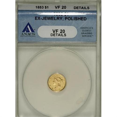 <B>1853 G$1 --Ex-Jewelry, Polished--ANACS. VF20 Details.</B></I> NGC Census: (0/7543). PCGS Population (1/4785). Mintage: 4,076,051. Numismedia Wsl. Price for NGC/PCGS coin in VF20: $148. (#7521)<BR><BR><B>Coin Engraver:</B> James B. Longacre<BR><BR><b>Shipping:</b> Coins & Currency (<a target="_blank" href="http://www.heritageauctions.com/common/shipping.php">view shipping information</a>)