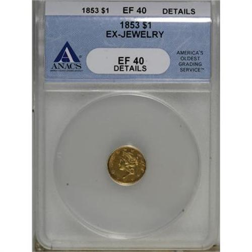 <B>1853 G$1 --Ex-Jewelry--ANACS. XF40 Details.</B></I> NGC Census: (0/7541). PCGS Population (12/4769). Mintage: 4,076,051. Numismedia Wsl. Price for NGC/PCGS coin in XF40: $178. (#7521)<BR><BR><B>Coin Engraver:</B> James B. Longacre<BR><BR><b>Shipping:</b> Coins & Currency (<a target="_blank" href="http://www.heritageauctions.com/common/shipping.php">view shipping information</a>)