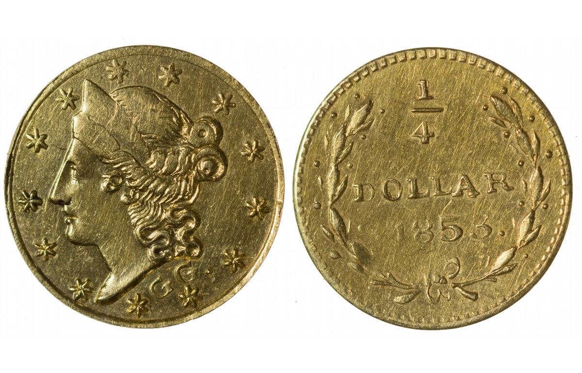 1853 Similar obverse, 3rd star close to tip of nose, upper part of head weak; 8 directly below 1st L on reverse. Extremely Rare: 12 recorded specimens in second edition of Breen-Gillio (probably including duplicates), none reported since. Flashy and brilliant, perhaps downgraded by PCGS because of weakness on hair and coronet, which is characteristic of this variety. PCGS AU58. Ex Kagin’s A.N.A. Milwaukee 8/8/1986, Lot 3515. The weakness of strike extends to the top half of the coin - the lower half has sharp details, especially the hairlines and stars, thus Totheroh`s grade of uncirculated. Serial# 26703056 Totheroh Collection HKA#63486