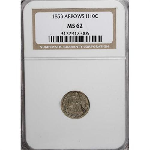 <B>1853 H10C Arrows MS62 NGC.</B></I> NGC Census: (152/470). PCGS Population (118/348). Mintage: 13,210,020. Numismedia Wsl. Price for NGC/PCGS coin in MS62: $200. (#4356)<BR><BR><B>Coin Engraver:</B> Christian Gobrecht<BR><BR><b>Shipping:</b> Coins & Currency (<a target="_blank" href="http://www.heritageauctions.com/common/shipping.php">view shipping information</a>)