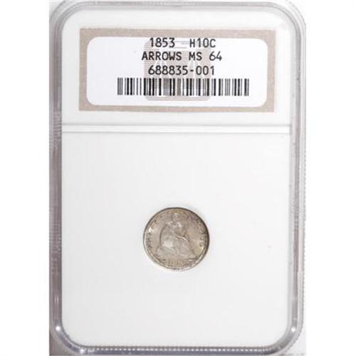 <B>1853 H10C Arrows MS64 NGC.</B></I> NGC Census: (188/126). PCGS Population (144/80). Mintage: 13,210,020. Numismedia Wsl. Price for NGC/PCGS coin in MS64: $480. (#4356)<BR><BR><B>Coin Engraver:</B> Christian Gobrecht<BR><BR><b>Shipping:</b> Coins & Currency (<a target="_blank" href="http://www.heritageauctions.com/common/shipping.php">view shipping information</a>)