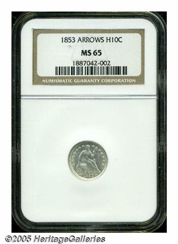 <B>1853<H10C> Arrows MS65 NGC.</B></I> A brilliant and highly lustrous example of this always-popular, short-lived type coin. This piece was struck from a later state of the dies, and as a result shows heavy metal flow in the fields. Well struck.