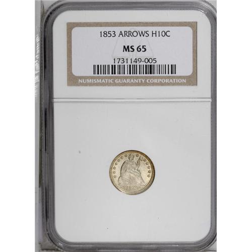 <B>1853<H10C> Arrows MS65 NGC.</B></I> A gorgeous Gem half dime whose fields have a faint violet cast. Highly lustrous with excellent detail and no major distractions.