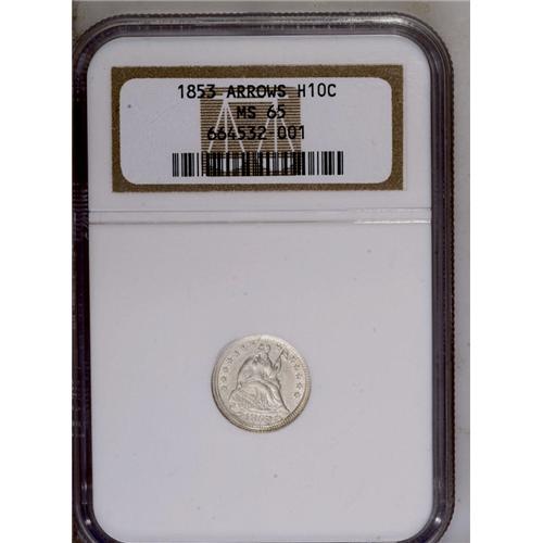 <B>1853<H10C> Arrows MS65 NGC.</B></I> A well struck example of this date, always an elusive half dime to find in MS65 and better grades. This coin displays bright, silver-white luster. There is an interesting die crack that crosses the reverse through both Ts in STATES to the F in OF.