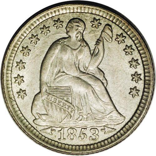 <B>1853<H10C> Arrows MS65 NGC.</B></I> Bold detail appears on the obverse, the reverse central area appearing to be soft due to noticeable clash marks appearing on both sides of this coin. The reflective mint glow is heightened by a mist of silver-gray toning evenly distributed over the entire surface.
