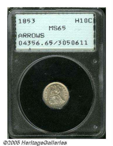 1853 H10C Arrows MS65 PCGS. Sharply struck, lustr