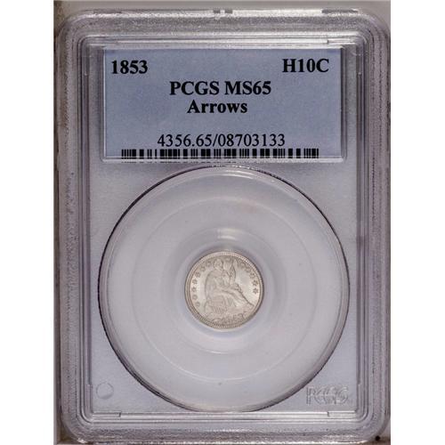<B>1853<H10C> Arrows MS65 PCGS.</B></I> Silver-gray surfaces exhibit nice luster and some whispers of light tan color around the borders. Well impressed on the design features. A couple of unobtrusive luster grazes are visible in the fields. Population: 42 in 65, 36 finer (3/06). <BR><BR><B>Important notice:</B> Heritage usually auctions material at the rate of 200-250 lots per hour. On some occasions eBay Live bid software or the Internet may not be able to keep up with the pace of the auction. We recommend placing a realistic absentee bid now as insurance to avoid disappointment. Occasionally the auctioneer may eliminate or reject an eBay Live bid, and the auctioneer may also reopen a lot after the close of the eBay live bidding (usually because we missed an audience bid), and may reject your bid even if it shows you as the winning bidder. By bidding via eBay Live, you agree that Heritage may award the lot to another bidder at its sole discretion under the circumstances described above or any other reasonable circumstances. Since eBay bids are not shown to us until we open the lot on the floor, we treat those bids just like floor bids. In most cases the floor responds before the eBay bid is presented to us, due to Internet lag time, so for consistency we have made it a policy that floor bids are always considered first over tie eBay live bids. Also please note that all Heritage lots purchased through eBay Live carry a 20% Buyer's Premium. Please make sure you read the Terms and Conditions before you bid. This lot is being auctioned in conjunction with a live floor auction by Heritage Galleries & Auctioneers. All final auction and invoice information will be supplied by Heritage Galleries & Auctioneers, and all other information should be considered preliminary. Lot:1888 <BR><BR><B>Winning Notification and Billing:</B> After the FINAL session in this auction is complete, Heritage will send e-mail and snail mail invoices. This process normally takes several days. All final auction and invoice information will be supplied by Heritage Galleries & Auctioneers, and all other information should be considered preliminary. <BR><BR>This auction will be conducted on a live auction floor and over the Internet through eBay Live. If you choose to place an absentee bid, please take a moment to <font color='#0000ff'><u><a href='http://pages.ebay.com/liveauctions/help/before/laabsentee.html'>learn how eBay Live absentee bidding works</a></u></font><font color='#000000'>