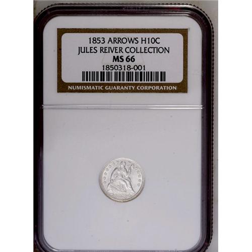 <B>1853<H10C> Arrows MS66 NGC.</B></I> Ex: Jules Reiver Collection. Bold detail appears on the obverse, the reverse central area appearing to be soft due to noticeable clash marks appearing on both sides of this coin. The reflective mint glow is heightened by a mist of silver-gray toning evenly distributed over the entire surface. Census: 37 in 66, 9 finer (6/06).