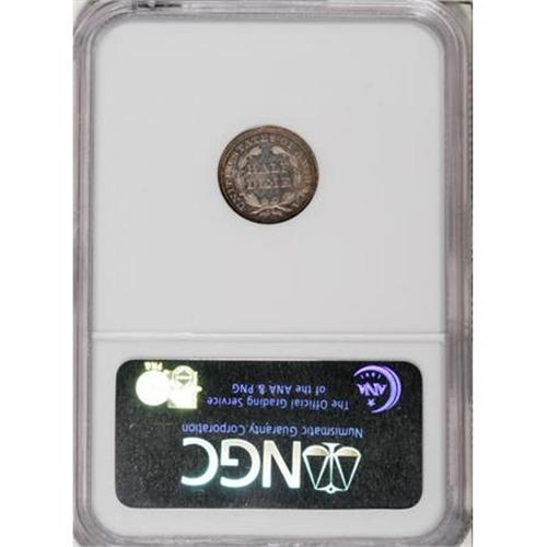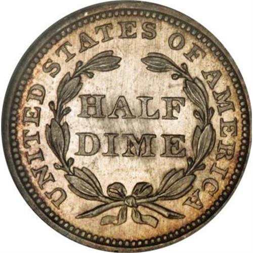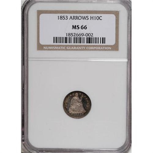 <B>1853 H10C Arrows MS66 NGC.</B></I> The 1853 Arrows half dime, with a mintage of more than 13 million pieces, is a common date readily available through the near-Gem level of preservation. MS65 and finer coins, on the other hand, are difficult to locate. Pastel purple and golden-brown toning enriches this Premium Gem, and a well directed strike brings out sharpness on the design elements. We note die polish lines in the fields, imparting prooflike tendencies and highlighting the mildly frosted motifs. Census: 39 in 66, 17 finer (12/07).<BR><BR><B>Coin Engraver:</B> Christian Gobrecht<BR><BR><b>Shipping:</b> Coins & Currency (<a target="_blank" href="http://www.heritageauctions.com/common/shipping.php">view shipping information</a>)