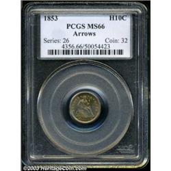 <table><tr><td><TABLE cellSpacing=0 cellPadding=0 width="100%" bgColor=#000000 border=0><TBODY> <TR><TD width="100%"><TABLE cellSpacing=1 cellPadding=3 width="100%" border=0><TBODY><TR><TD width="100%" bgColor=#79735c><FONT face=arial color=#ffffff size=3><B>Description</B> </FONT></TD></TR><TR><TD width="100%" bgColor=#ffffff><FONT face=arial size=2><B>1853 H10C Arrows MS66 PCGS.</B></I> A beautifully toned Gem that has immaculate surfaces. Both obverse and reverse have a coating of lovely sea-green and russet colors. Portions of the wreath are typically struck, but the stars and Seated Liberty are bold. While not a rare issue by half dime standards, the Arrows issue was struck for just three years, and premium Gem examples are in strong demand as type coins. Struck from lightly clashed dies. Population: 30 in 66, 3 finer (10/03). </FONT></TD></TR></TBODY></TABLE></TD></TR></TBODY></TABLE><BR><A name=PricesRealized></A><TABLE cellSpacing=0 cellPadding=0 width="100%" bgColor=#000000 border=0><TBODY><TR><TD width="100%"><TABLE cellSpacing=1 cellPadding=3 width="100%" border=0><TBODY><TR><TD width="100%" bgColor=#79735c><A name=PR><FONT face=arial color=#ffffff size=3><B>Previous Prices from Heritage Auctions</B> </FONT></A></TD></TR><TR><TD bgColor=#f6f6ed><TABLE cellSpacing=0 cellPadding=0 width="100%" border=1><TBODY><TR><TD align=middle width="33%"><B>Date</B></TD><TD align=middle width="33%"><B>Service</B></TD><TD align=middle width="33%"><B>Price</B></TD></TR><TR bgColor=whitesmoke><TD width="33%"><B>07/03/2001</B></TD><TD width="33%">NGC</TD><TD width="33%">$2,350.00</TD></TR><TR bgColor=whitesmoke><TD width="33%"><B>01/11/2003</B></TD><TD width="33%">NGC</TD><TD width="33%">$891.25</TD></TR><TR bgColor=whitesmoke><TD width="33%"><B>08/02/1997</B></TD><TD width="33%">NGC</TD><TD width="33%">$1,495.00</TD></TR><TR bgColor=whitesmoke><TD width="33%"><B>06/01/2001</B></TD><TD width="33%">PCGS</TD><TD width="33%">$2,415.00</TD></TR></TBODY></TABLE></TD></TR><TR><TD bgColor=#ffffff><FONT face=arial size=1 ?>PLEASE NOTE: All prices realized reflect the final hammer price PLUS the buyer's premium in auctions that charge a buyer's premium. Each item has a notation at the top of the listing indicating whether that lot included a buyer's premium. Example: A item that sells with a final hammer price of $100 and a 20% buyer's premium will display with a price realized of $120. All information listed is intended to be as accurate as possible, but errors are possible. Please use this guide carefully and inform us of any inaccuracies. </FONT></TD></TR></TBODY></TABLE></TD></TR></TBODY></TABLE><BR><TABLE cellSpacing=0 cellPadding=0 width="100%" bgColor=#000000 border=0><TBODY><TR><TD width="100%"><TABLE cellSpacing=1 cellPadding=3 width="100%" border=0><TBODY><TR><TD width="100%" bgColor=#79735c colSpan=6><FONT face=arial color=#ffffff size=3><B>Price Guide*</B> </FONT></TD></TR><TR bgColor=#f6f6ed><TD align=middle><B>Grade</B> </TD><TD align=middle><B>Coin World<BR>(Trends)</B> </TD><TD align=middle><B>Numismedia<BR>Retail</B> </TD><TD align=middle><B>Numismedia<BR>Wholesale</B> </TD><TD align=middle><B>Coin<BR>Universe</B> </TD><TD align=middle><B>Heritage<BR>Value Index</B> </TD></TR><TR bgColor=#ffffff><TD align=middle>65</TD><TD align=right>$1,725.00</TD><TD align=right>---</TD><TD align=right>$1,475.00</TD><TD align=right>$2,250.00</TD><TD align=right>$1,141.38</TD></TR><TR style="FONT-WEIGHT: bold" bgColor=#cccfdd><TD align=middle>66</TD><TD align=right>---</TD><TD align=right>---</TD><TD align=right>$3,625.00</TD><TD align=right>$5,500.00</TD><TD align=right>$2,960.00</TD></TR><TR bgColor=#ffffff><TD align=middle>67</TD><TD align=right>---</TD><TD align=right>---</TD><TD align=right>$16,500.00</TD><TD align=right>$18,900.00</TD><TD align=right>$8,565.00</TD></TR><TR bgColor=#ffffff><TD colSpan=6><FONT size=1>*All information listed is intended to be as accurate as possible, but errors are possible. No item may be returned or refused based on this information which is provided as a service to our customers. You should contact each pricing source directly to determine the accuracy of this information. </FONT></TD></TR></TBODY></TABLE></TD></TR></TBODY></TABLE><BR><TABLE cellSpacing=0 cellPadding=0 width="100%" bgColor=#000000 border=0><TBODY><TR><TD width="100%"><TABLE cellSpacing=1 cellPadding=3 width="100%" border=0><TBODY><TR><TD width="100%" bgColor=#79735c><FONT face=arial color=#ffffff size=3><B>Population Guide</B> </FONT></TD></TR><TR bgColor=#ffffff><TD align=middle><!-- Begin Output of Population Grid--><TABLE cellSpacing=0 cellPadding=0 width="100%" border=0><TBODY><TR><TD vAlign=center><TABLE cellSpacing=0 width="100%" border=1 cellsadding="3"><TBODY><TR><TD vAlign=center><TABLE cellSpacing=0 cellPadding=3 width="100%" border=1><TBODY><TR><TD vAlign=center align=middle bgColor=#f0f1e8 colSpan=2 <CENTER><FONT face=Arial size=2><B>PCGS Pop </B></FONT><CENTER></CENTER></TD><TD vAlign=center align=middle bgColor=#f0f1e8 colSpan=2><CENTER><FONT face=Arial size=2><B>NGC Pop</B></CENTER></FONT></TD></TR><TR><TD vAlign=center><FONT face=Arial size=2>(66)</FONT> </TD><TD vAlign=center align=right><FONT face=Arial size=2>30</FONT> </TD><TD vAlign=center><FONT face=Arial size=2>(66)</FONT> </TD><TD vAlign=center align=right><FONT face=Arial size=2>33</FONT> </TD></TR><TR><TD vAlign=center><FONT face=Arial size=2>(>66)</FONT> </TD><TD vAlign=center align=right><FONT face=Arial size=2>3</FONT> </TD><TD vAlign=center><FONT face=Arial size=2>(>66)</FONT> </TD><TD vAlign=center align=right><FONT face=Arial size=2>5</FONT> </TD></TR></TBODY></TABLE></TD></TR></TBODY></TABLE></TD></TR></TBODY></TABLE><!-- End Output of Population Grid--></TD></TR></TBODY></TABLE></TD></TR></TBODY></TABLE><BR><TABLE cellSpacing=0 cellPadding=0 width="100%" bgColor=#000000 border=0><TBODY><TR> Important notice: Heritage usually auctions material at the rate of 200-250 lots per hour. On some occasions eBay Live bid so