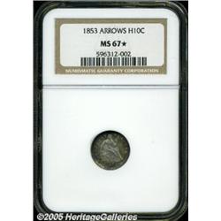 <B>1853 H10C Arrows MS67 <img border='0' src='http://www.heritagecoins.com/images/star.gif' width=10 height=10> NGC.</B></I> Pursuant to the Mint Act of February 21, 1853, the half dime, like its dime, quarter, and half dollar counterparts, had its weight decreased in order to facilitate circulation and decrease the melting of subsidiary and gold coinage. In order to help citizens of the 1850s distinguish these new lightweight half dimes from their old tenor counterparts, arrowheads were placed on each side of the date, which coincidentally created an important three-year type for today's collectors. This is a sharply struck example that displays exemplary luster characteristics. The obverse has thick, frosted mint luster, while the reverse is even brighter with evidence of light die striations in the fields. This is technically an iridescent coin with many colors present. However, the centers are primarily lilac and lime-green and turn to rich, deep rainbow coloration around the margins. Essentially abrasion-free surfaces with extraordinary eye appeal. Population: 2 in MS67 <img border='0' src='http://www.heritagecoins.com/images/star.gif' width=10 height=10>, none are finer (2/05).