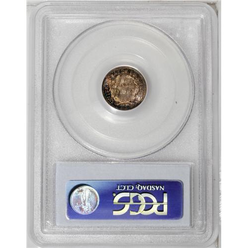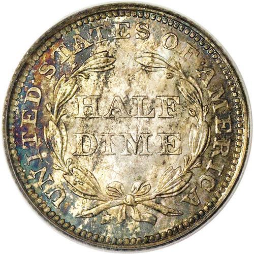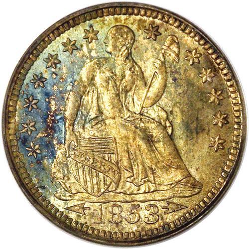 <B>1853<H10C> Arrows MS67 PCGS.</B></I> A Superb Gem example of the 1853 Arrows half dime issue with extraordinary design definition, splendid mint frost, and lovely gold, blue, and lilac toning. Every individual feature of the design on both sides is sharply detailed, including the stars and Liberty's head detail on the obverse, and all of the individual leaves on the reverse. The border dentils on the left side of the obverse and reverse are slightly soft, but still completely detailed. Intense luster radiates through the gorgeous toning. The obverse is mostly light gold with considerable sky-blue toning to the left. The reverse is also primarily toned in gold, interspersed with pale violet. The left reverse border is accented by vibrant blue, lilac, and russet colors. This is a spectacular example in every sense. Population: 7 in 67, 0 finer (7/06).