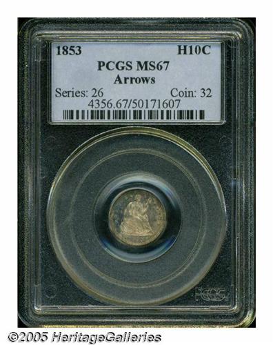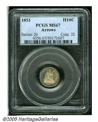 <B>1853<H10C> Arrows MS67 PCGS.</B></I> An extraordinary 1853 Arrows half dime that must be seen to be truly appreciated. Not only is the strike boldly executed, but there is little evidence of die clashing and generous mint frost is visible beneath golden-gray, crimson, and turquoise toning. Quite a few of these were spared from circulation by 19th century standards, but only a select few possess such remarkable technical and aesthetic merits. Population: 5 in 67, 0 finer (4/05).
