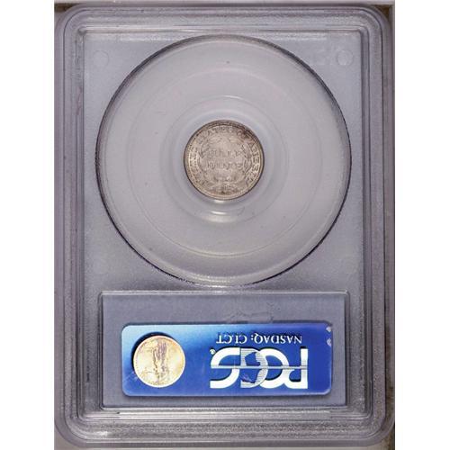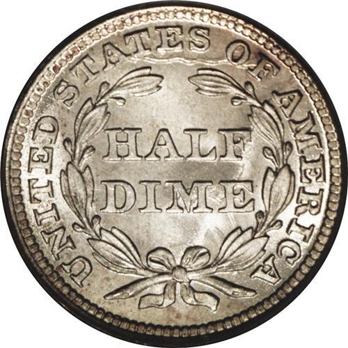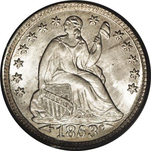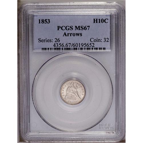 <B>1853<H10C> Arrows MS67 PCGS.</B></I> Pursuant to the Mint Act of February 21, 1853, that reduced the official silver coin weights of the half dime, dime, quarter, and half dollar to the point where melting would no longer be profitable, arrows were placed on either side of the date as distinctive markings to distinguish between the heavier older coins and lighter newer ones. The 1853 With Arrows has the highest mintage (13,210,020 pieces) of all of the dates in the half dime series, and as such is a common date readily available in all but the highest Mint State grades. PCGS and NGC have, to date, certified only 16 examples in MS67, the grade of the piece offered in the present lot.<BR> This coin displays excellent luster, and is visited by speckles of light russet color around the borders. The design elements are sharply struck, with strong definition in the star centers, in Liberty's hair, and on the leaf ribbing. Impeccably preserved surfaces are devoid of mentionable abrasions, and display mint-made clash marks on both sides. Population: 7 in 67, 0 finer (4/06).