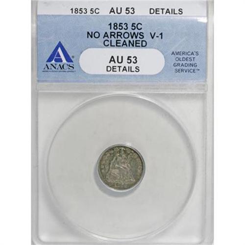 <B>1853 H10C No Arrows--Cleaned--ANACS AU53 Details.</B></I> V-1. NGC Census: (3/108). PCGS Population (1/73). Mintage: 135,000. Numismedia Wsl. Price for NGC/PCGS coin in AU53: $329. (#4351)<BR><I>From The Al Blythe Collection of Half Dimes.</B></I><BR><BR><B>Coin Engraver:</B> Christian Gobrecht<BR><BR><b>Shipping:</b> Coins & Currency (<a target="_blank" href="http://www.heritageauctions.com/common/shipping.php">view shipping information</a>)