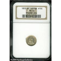<B>1853 H10C No Arrows MS64 NGC.</B></I> A touch of light tan patina is noted over lustrous surfaces that are seemingly unmarked, save for some mild clash marks (as made) over each side. Population: 40 in 64, 26 finer (1/05). Lot:6129