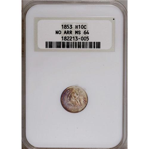 1853 H10C No Arrows MS64 NGC. The obverse is toned in 1853[H10C] No Arrows MS64 NGC.