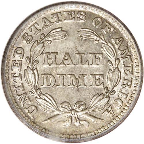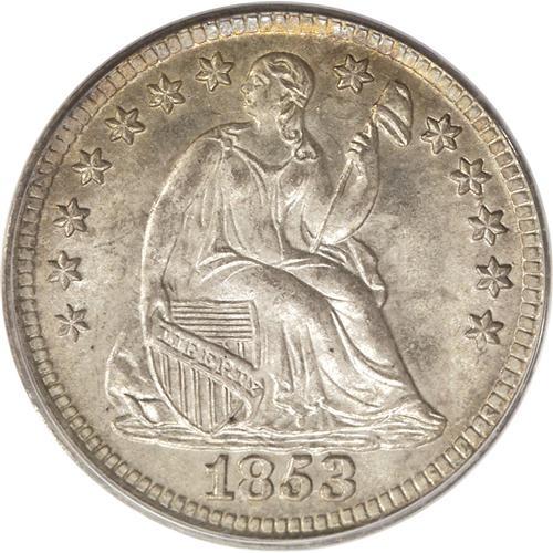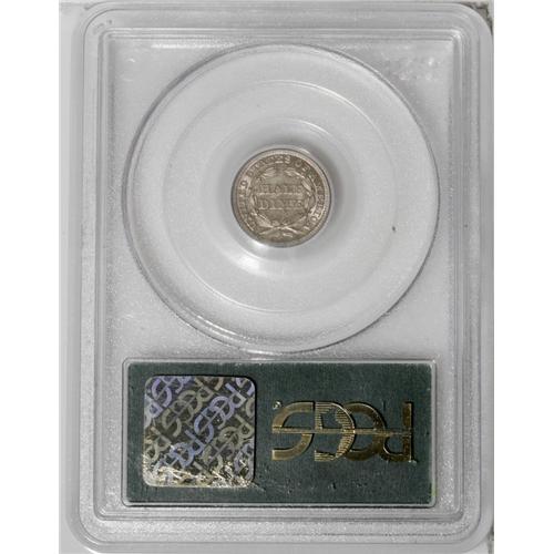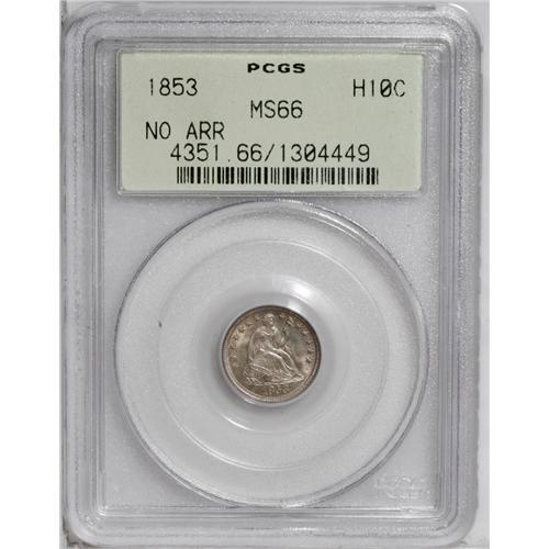 <B>1853<H10C> No Arrows MS66 PCGS.</B></I> Pastel reddish-gray hues enrich this lustrous and lovely Premium Gem. Unblemished surfaces provide exceptional eye appeal. Although 13.2 million Arrows dimes were struck at Philadelphia in 1853, the No Arrows issue, presumably struck early in the year, has a vastly smaller mintage of 135,000 pieces, of which many were subsequently melted. Struck from lightly clashed dies. Population: 6 in 66, 2 finer (7/06).