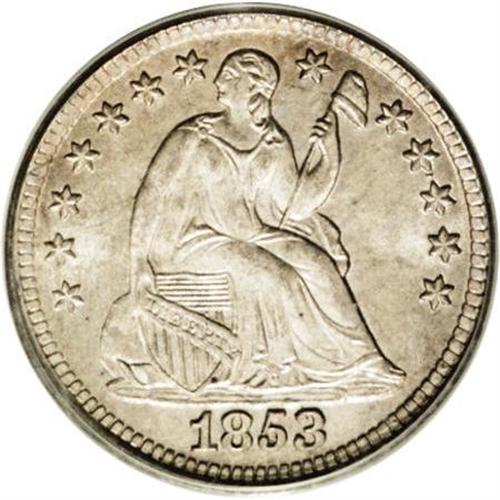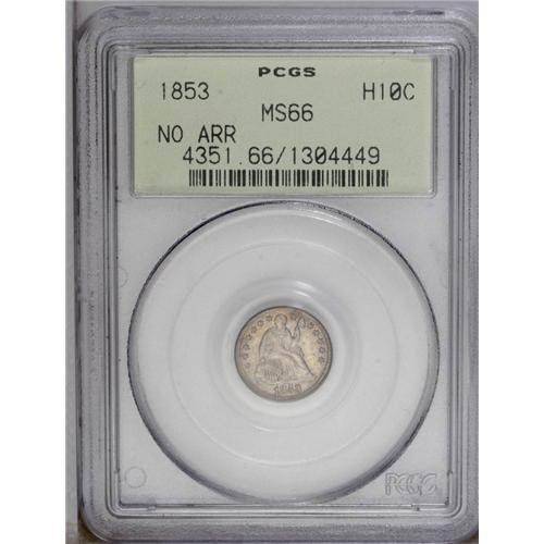 <B>1853<H10C> No Arrows MS66 PCGS.</B></I> Pastel salmon-pink and pale gold hues enrich this lustrous and lovely Premium Gem. Unblemished surfaces provide exceptional eye appeal. Although 13.2 million Arrows dimes were struck at Philadelphia in 1853, the No Arrows issue, presumably struck early in the year, has a vastly smaller mintage of 135,000 pieces. Struck from lightly clashed dies. Population: 6 in 66, 2 finer (2/06).