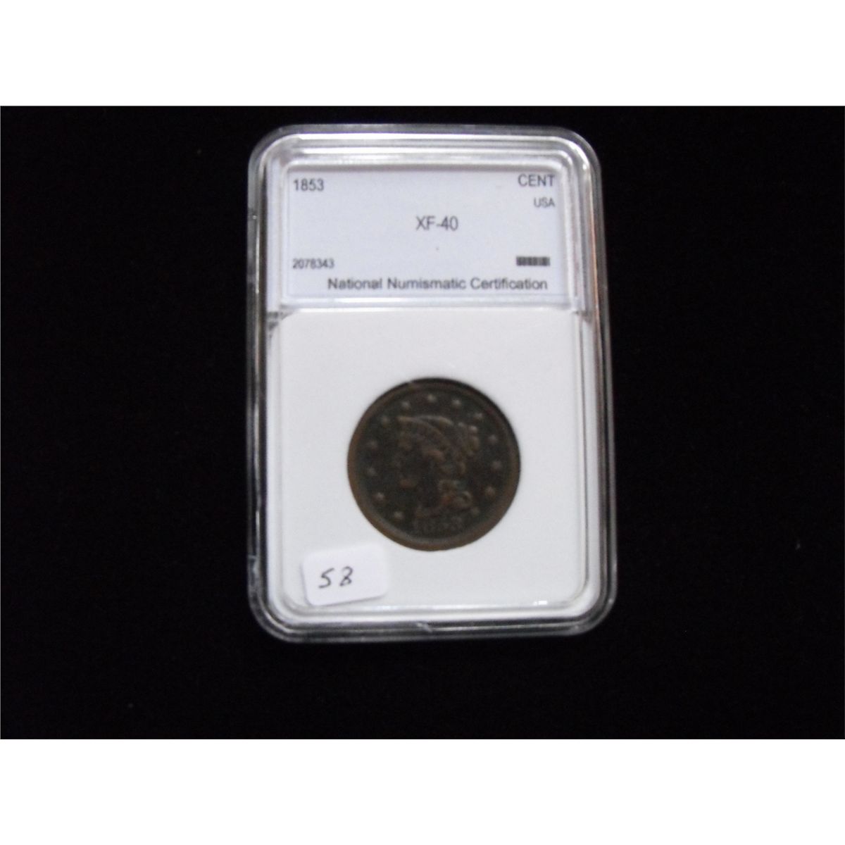 1853 LARGE BRAIDED HAIR CENT XF 40