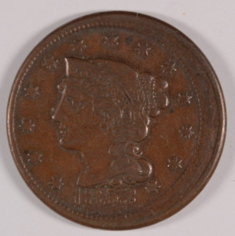 1853 LARGE CENT, RARE OFF-CENTER MINT ERROR. VF+ HARD TO FIND THIS TYPE ERROR