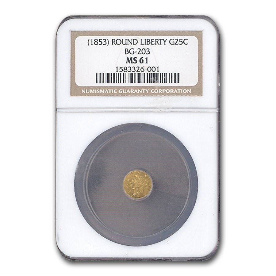 (1853) Liberty Round 25 Cent Gold MS-61 NGC (BG-203)