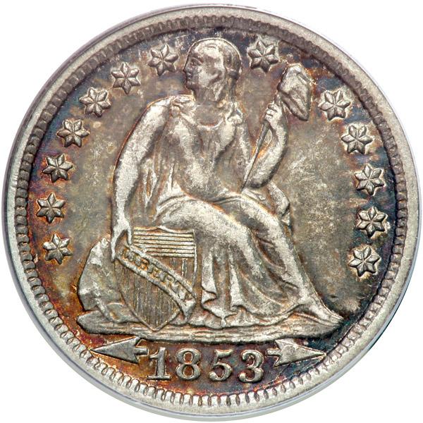1853. Arrows. PCGS graded AU-50. Nicely toned (PCGS # 4603) .