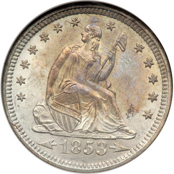 1853 Liberty Seated Quarter Dollar. Arrows and rays. NGC graded MS-64. A nice frosty coin. Pop 139; 37 finer .