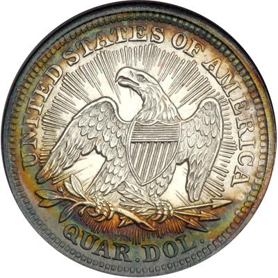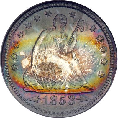 1853 Liberty Seated Quarter Dollar. Arrows and rays. NGC graded MS-66. Attractive rainbow toning exists on both sides. A simply superb specimen of the first year of the new seated Liberty type, after the weight reduction and the addition of arrows and rays to the types. Shimmering luster underlies the color and so propels all its hues into your field of vision. Sharply struck devices. The small handful of Gems of this type suggests that most were circulated. The (For those who recall the history of this one-year Type, the Mint mounted the newly designed dies and began striking the reduced weight Quarters in late April 1853.) Pop 6; 3 finer in 67.