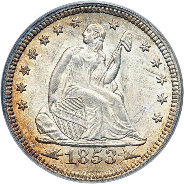 1853. Arrows and rays. PCGS graded MS-64. A well struck and very frosty example that is a Premium Quality coin for the grade. Lovely delicate golden toning rests about the borders which adds to its appeal. A popular one-year type coin that is always in demand. Pop 143; 16 in 65, 5 in 66, 2 in 67 (PCGS # 5426) .