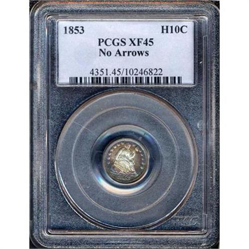 <b>1853 Liberty Seated Half Dime. No arrows. PCGS graded EF45.</b> Well struck and attractively toned; this probably resided in an old coin album from the colorful toning at the rim. Scarce: 135,000 minted <b>(PCGS # 4351)</b> <i>