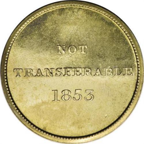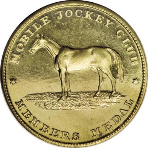 <B>1853 Mobile Jockey Club, Mobile, AL, PR63 Cameo Uncertified.</B></I> Miller-Ala-2. Brass, 28 mm. Collectors of pre-Civil War tokens know that examples from Southern states are scarce. Nonetheless, the obverse of this variety, which features a horse facing left, is familiar to collectors. One reason for this is that the obverse was muled with various unrelated dies (such as a bust of Washington) as delicacies for collector sale. The present piece is paired with its proper reverse die, and is struck as a proof with flashy fields and frosty devices.<BR><BR><b>Shipping:</b> Coins & Currency (<a target="_blank" href="http://www.heritageauctions.com/common/shipping.php">view shipping information</a>)