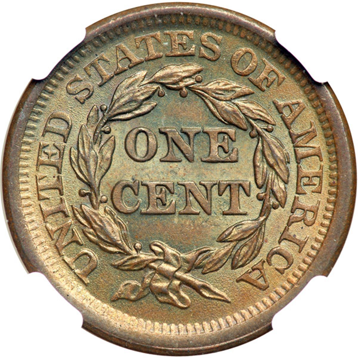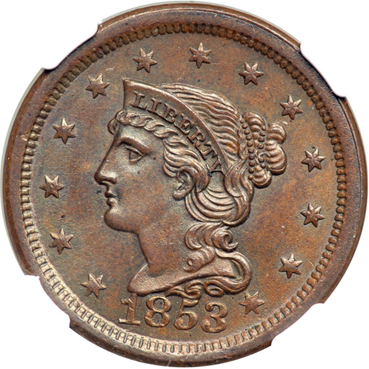 1853 N-10 R1 Repunched 18 NGC graded MS66 Brown. Frosty light olive and steel brown. Satiny mint luster covers both sides, especially on the reverse. The only marks are a couple barely visible nicks on the rim under the 53, a pair of tiny ticks on the 18, and a microscopic planchet flake over star 2. The reverse is choice. MDS, die state b. The repunching inside the top of the 8 and under the 1 remains visible. Our grade is MS62. The attribution is noted on the NGC label.