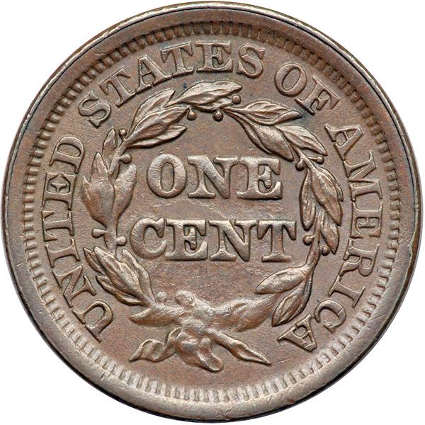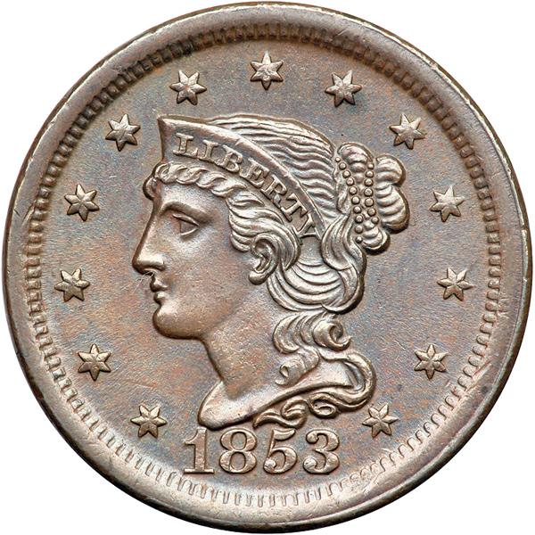 1853 N-17 R2. AU-58. Repunched 1. Lustrous light chocolate and steel brown. Great eye appeal. Looks mint state but there is a hint of rub on the highest points of the design. M-LDS, die state b. The dash left of the base of the 1 (from a misplaced 1) is weak but visible and shallow low spots caused by debris on the die cover much of the field inside the wreath.