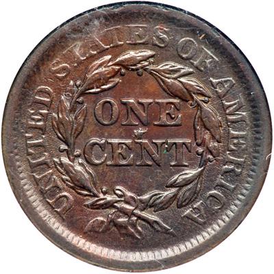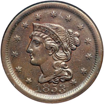 1853 N-21 R4. NGC graded MS-62 Brown. Glossy olive brown and chocolate. A choice cent, just lightly worn. A tiny nick on the rim over star 8 is a good identifying mark. M-LDS, die state b. The fields are covered with radial die flowlines and the points seen in the early state are gone. Our grade is EF45. The attribution and Reiver provenance are noted on the NGC label.