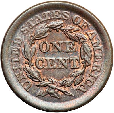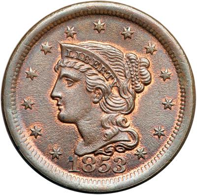 1853 N-23 R4. MS-62. Stray 4 in Hair Right of Ear. Lustrous light olive and bluish steel with 10-15% of the original mint red remaining on both sides. Excellent eye appeal, just a few tiny specks of dark toning away from choice. The only notable spot is located on the peak of the 1. LDS, die state b. The fields are covered with strong radial die flowlines, strongest on the obverse, and they create attractive cartwheel luster that adds to the eye appeal. The stray 4 in the hair just right of the ear is visible but not strong. Much of the neck is covered with a very shallow low spot, as usual on this die variety. A nice example of this popular variety, CC#5 in the Grellman census.