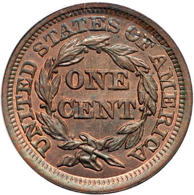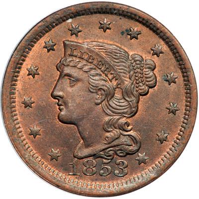 1853 N-25 R1. PCGS graded MS-64 Red & Brown. Repunched 1 & 3. Frosty mint red fading to olive and steel. About half the faded mint color remains on the obverse and 25% on the reverse. The surfaces are satiny and attractive but there are a few specks of darker toning around star 8 and a mint-made planchet crease through OF. MDS, die state b. The repunching at the bottom of the 1 & 3 remains visible but the fine die lines found on the early state of the reverse are gone. Our grade is MS63.