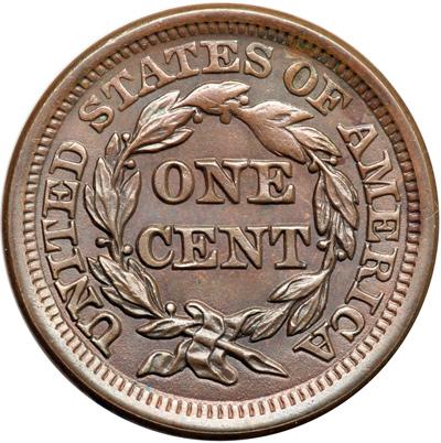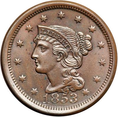 1853 N-25 R1. MS-60. Repunched 1 & 3. Lustrous light chocolate and bluish steel brown with faint hints of underlying faded mint color. There are a few small spots of darker toning before the portrait and a diagonal nick in the field right of star 3. The surfaces are satiny and offer nice eye appeal in spite of the trivial marks. MDS, die state b. The repunching at the bottom of the 1 & 3 is clear.