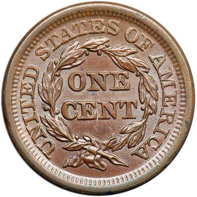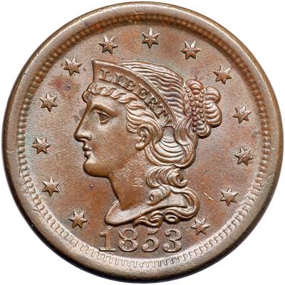 1853 N-28 R4-. MS-60. Repunched 1. Lustrous light chocolate and steel brown with peeps of faded mint color visible in a couple places on the obverse. A speck of greenish verdigris shows under star 5 and a tiny struck-through line passes through the left side of the 8 in the date (where a tiny piece of wire or cloth fiber was stuck to the die). Otherwise this cent is choice. MDS, die state b. The repunching is still clear under the peak of the 1. Tied for CC#7. Removed from a PCGS slab graded MS63BN (PCGS label included).