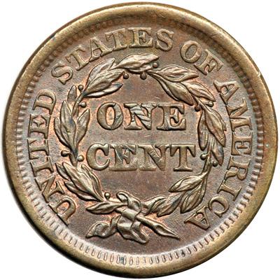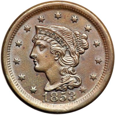 1853 N-28 R4-. AU-50. Repunched 1. Sharpness very close to mint state but there is a dull scrape on the eyebrow, across the lower edge of the bust, and on the letters of ONE and EN in CENT. The scrapes do not break the toning and the cent still offers mint state appeal to the unaided eye. Lustrous light chocolate and bluish steel with generous traces of original mint red remaining on the reverse. MDS, die state b. Dull but clearly visible die lines extend from the dentils at stars 4 & 12, and the repunching on the 1 is still obvious under the peak. Removed from an ANACS slab graded MS61 Brown (ANACS label included).