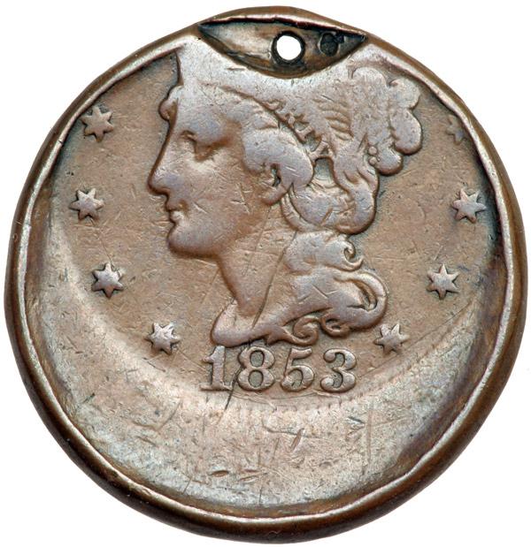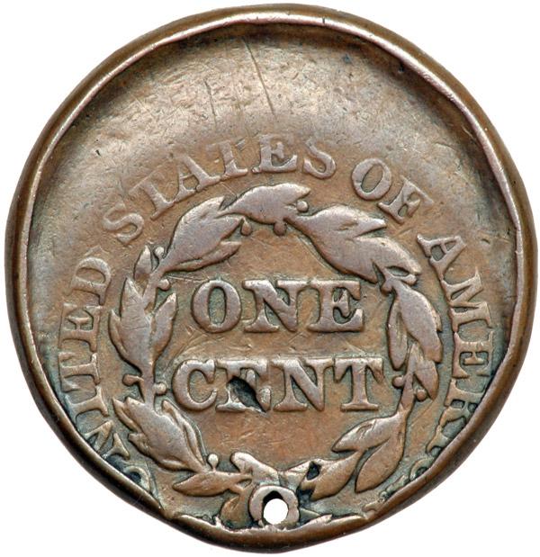 1853 N-29 R3 G6. Off Center with Indent. Sharpness VG10 but there is a small hole through the tab above the head and a dig on the E in CENT. Otherwise the surfaces are smooth and the color is an attractive glossy light chocolate brown. Struck 30% off center to K-12.5. In addition, there is a strong indent at the top of the obverse created when this planchet overlapped with another. It appears the tab error came first, then the off center strike. The protruding part of the tab was carefully rolled or tapped down to make the cent round.