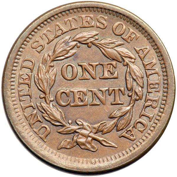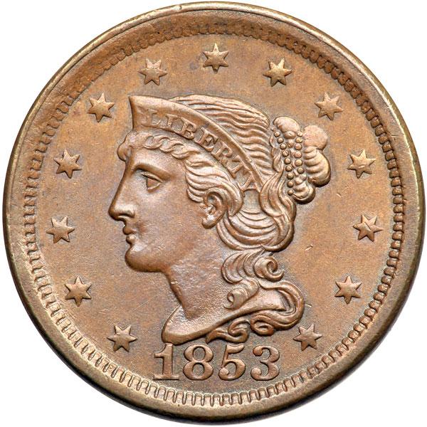 1853 N-29 R3+ MS60. Frosty steel brown with delicate overtones of bluish steel. The only marks are a faint hairline in the field over star 1 and a tiny pinprick in the field right of the main curl. MDS, die state b. The fine die lines from the front edge of the neck are gone while the lines from the dentils at stars 1 & 2 are dull but still visible. Removed from a PCGS slab graded MS64BN (PCGS label included). DWH #2267.