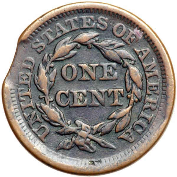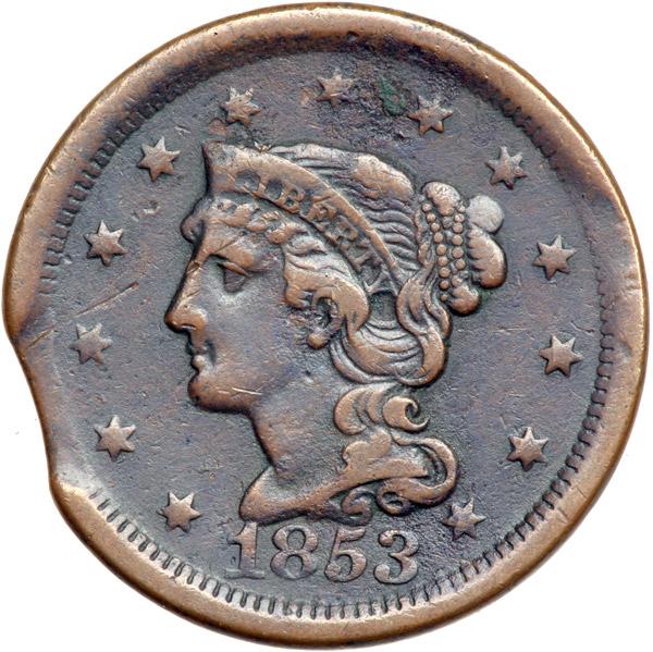 1853 N-29 R3 VG10. Clipped Planchet. Five points sharper but there is a patch of fine corrosion at stars 7-8. Otherwise the surfaces are decent with only a few marks, including a disjointed scratch from over star 3 to the eyebrow. Rather glossy dark olive with lighter chocolate high points. A planchet clip affects the dentils at stars 2-3 and over ED-S, and the dentils directly across from the clip are weak, the so-called Blakesly effect seen on cents struck on clipped planchets. DWH #3358.