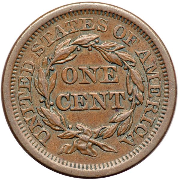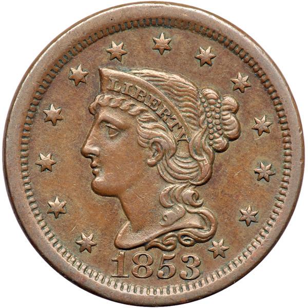 1853 N-31 R4+ EF40. Choice glossy light chocolate brown with frost showing in many of the protected areas. A beautiful cent, virtually flawless. MDS, die state b.