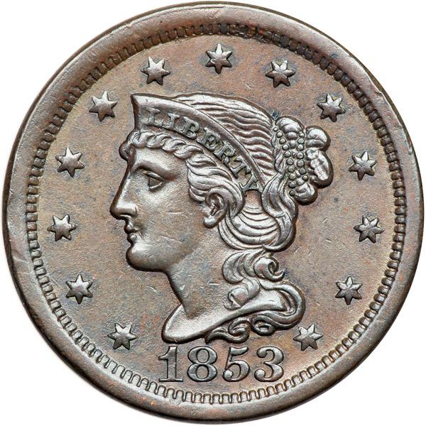 1853 N-31 R4+ VF35. Sharpness EF40 or slightly better but there are a couple very light rim bruises at stars 3 & 4 and another at CA in AMERICA. Frosty steel brown and chocolate with some lighter chocolate toning in protected areas on the obverse. Excellent eye appeal in spite of the minor marks. MDS, die state b. Tied for CC#12 of this tough die variety.